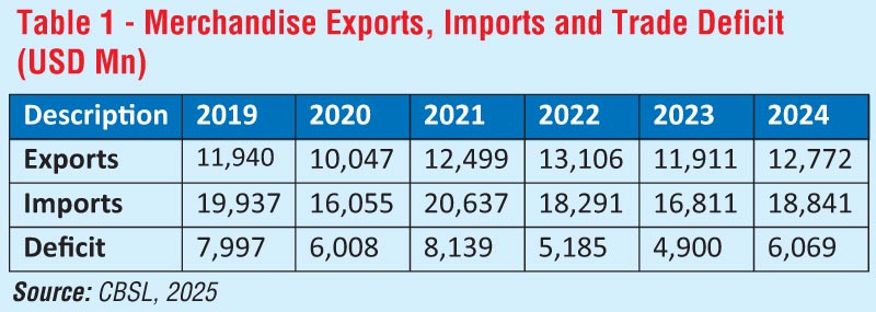 Although merchandise exports grew by 7.2% in 2024, merchandise imports increased by 12.1%, resulting in a widening trade deficit. Consequently, the trade deficit expanded from $ 4.9 billion in 2023 to $ 6 billion in 2024 as illustrated in the Table 01. This widening gap underscores the urgency of implementing effective policy measures aimed at boosting export performance and curbing import dependency to minimise the trade deficit.