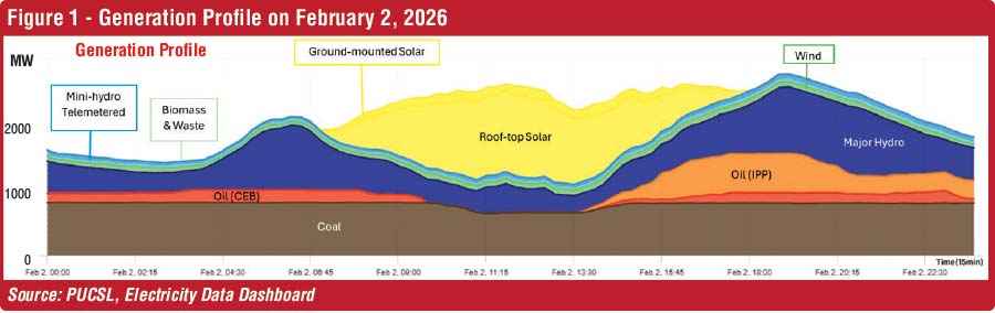 The plan’s treatment of rooftop solar further illustrates the gap between diagnosis and action. Sri Lanka had 1,700 MW of rooftop solar by mid-2025, much of it invisible to system operators, lacking telemetry, and installed with inverters that do not comply with modern grid support standards. Rooftop solar is now the major daytime power source (Figure 1).