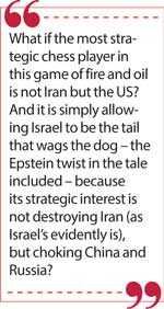 Which reminds me to float a theory: what if the most strategic chess player in this game of fire and oil is not Iran but the US? And it is simply allowing Israel to be the tail that wags the dog – the Epstein twist in the tale included – because its strategic interest is not destroying Iran (as Israel’s evidently is), but choking China and Russia? That would explain why Donald Trump had Delta Force violate Venezuela’s sovereignty and arrest Maduro while Europe kept stumm: it’s all the oil that would bolster Uncle Sam’s Middle-Eastern misadventures.