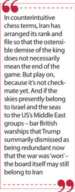 But play on, because it’s not checkmate yet. And if the skies presently belong to Israel and the seas to the US’s Middle East groups – bar British warships that Trump summarily dismissed as being redundant now that the war was ‘won’ – the board itself may still belong to Iran.