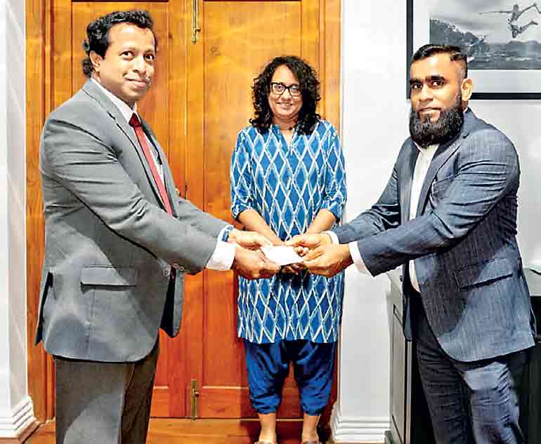 The Technocity Chairman and Founder Famy Ismail (right) hands over the contribution to Prime Minister Dr. Harini Amarasuriya. Others from left: The Technocity Head – Digital Marketing Sanjula Hettige, CFO Jaseem Junaideen, Head – Retail Minhaj Farook, CEO Akram Badurdeen, Secretary to Prime Minister G. Pradeep Saputhanthri, The Technocity Distribution Manager Gehan Thangappan, Distribution Head – Gaming Mohamed Kadeer Ismath, and Nizran Ziyath