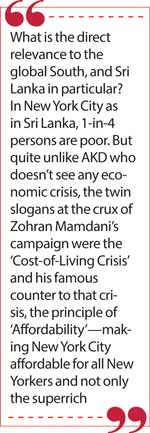 What is the direct relevance to the global South, and Sri Lanka in particular? In New York City as in Sri Lanka, 1-in-4 persons are poor. But quite unlike AKD who doesn’t see any economic crisis, the twin slogans at the crux of Zohran Mamdani’s campaign were the ‘Cost-of-Living Crisis’ and his famous counter to that crisis, the principle of ‘Affordability’—making New York City affordable for all New Yorkers and not only the superrich.