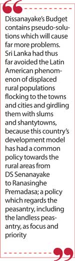 His Budget contains pseudo-solutions which will cause far more problems. Sri Lanka had thus far avoided the Latin American phenomenon of displaced rural populations flocking to the towns and cities and girdling them with slums and shantytowns, because this country’s development model has had a common policy towards the rural areas from DS Senanayake to Ranasinghe Premadasa; a policy which regards the peasantry, including the landless peasantry, as focus and priority.