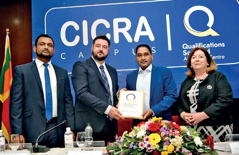 CICRA Holdings Group Director, CEO Boshan Dayaratne (right) receives the certification from SQA International Regional Manager Mark Hill. SQA International Regional Manager Margret Curran (extreme right) CICRA Campus Head of Academics Tharaka Soysa are also present