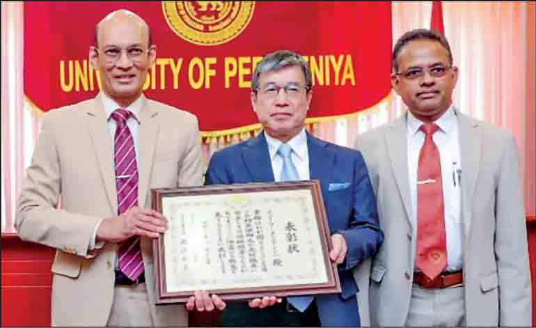 Ambassador of Japan to Sri Lanka Akio Isomata recently awarded a Certificate of Commendation to Prof. Sajjiv Ariyasinghe Senior Professor of Physiology at the Faculty of Dental Sciences, University of Peradeniya. This recognition celebrates Prof. Ariyasinghe’s outstanding contributions to the deepening of mutual understanding and friendship between Japan and Sri Lanka. This awarding ceremony took place on the occasion of the “International Week” conducted by the University with the presence of Deputy Vice Chancellor Prof. Ranjith W. Pallegama, other faculty members and students.