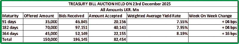 Nevertheless, the auction was undersubscribed, raising only 54.97% or Rs. 82.45 billion out of the entire Rs. 150 billion offered. The bids received-to-offered amount ratio was 1.31 times.