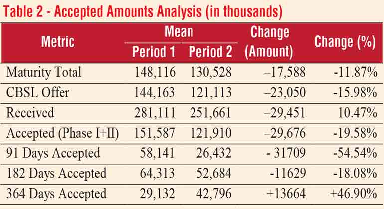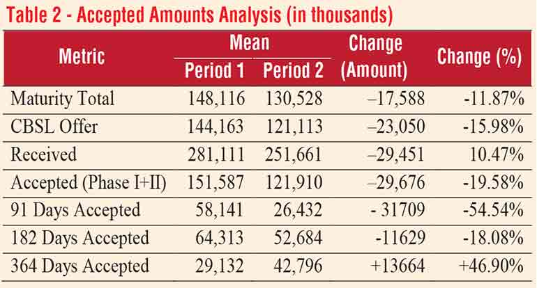 Table 2 presents a comparative analysis of auction-level activity, including maturity totals, Central Bank offers, received bids, total accepted amounts (Phase I and II), and maturity-wise accepted amounts for both periods.