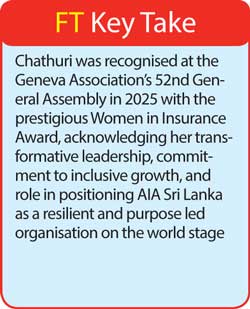 In recognition of outstanding leadership. AIA Sri Lanka Director/CEO Chathuri Munaweera continued to earn widespread recognition in 2025 for her exemplary leadership and impact on the insurance and business landscape. She was honoured at the Vanithabhimana Awards 2025 in the Corporate and Professional category, recognising her influence and excellence as a leading woman in business, and was also named a Distinguished Award Winner at the Global CEO Top Businesswomen Awards 2025, celebrating her achievements and contributions to Sri Lanka’s corporate sector. Further reinforcing her global standing, Chathuri was recognised at the Geneva Association’s 52nd General Assembly in 2025 with the prestigious Women in Insurance Award, acknowledging her transformative leadership, commitment to inclusive growth, and role in positioning AIA Sri Lanka as a resilient and purpose led organisation on the world stage.