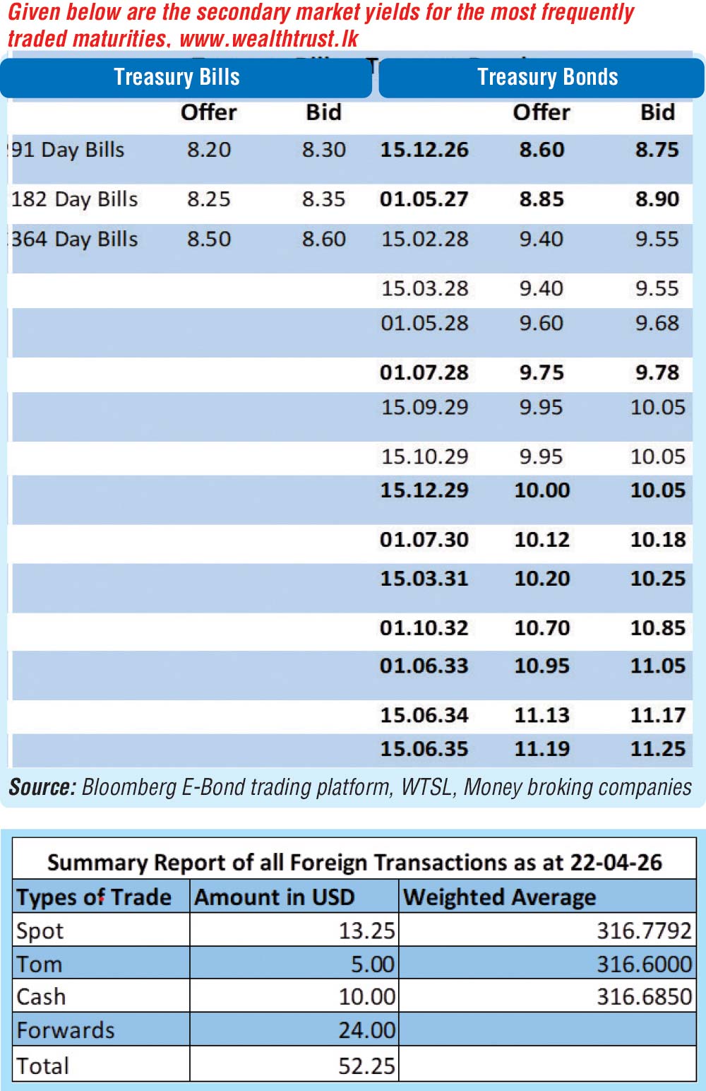 The total secondary market Treasury Bond/Bill transacted volume for 22 April was Rs. 36.95 billion.
