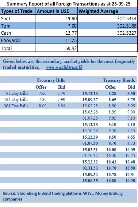 The total USD/LKR traded volume for 23 September 2025 was $ 50.92 million.