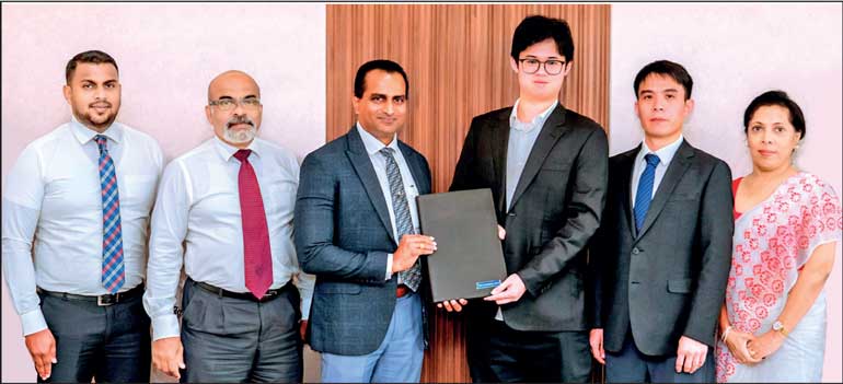 Commercial Bank Assistant General Manager – Personal Banking Kapila Liyanage, exchanges agreement with Baili Investments Director Xueyuan Deng, in presence of senior representatives of two companies