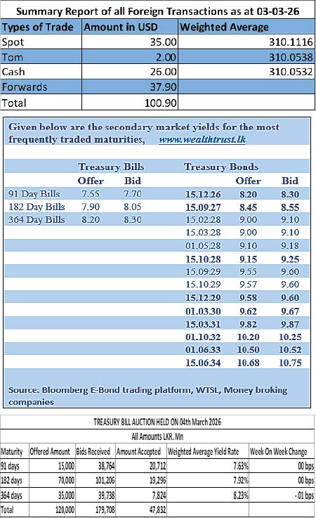The total secondary market Treasury Bond/Bill transacted volume for 3 March was Rs. 15.96 billion.