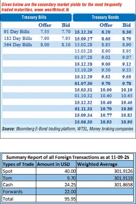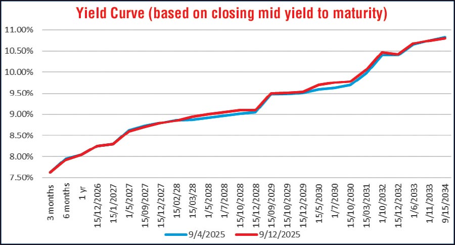 This was followed by a round of Treasury Bond auctions held last Thursday (11 Sept.), with a total offered amount of Rs. 155.00 billion across three maturities. The round of auctions overall raised only Rs. 116.16 billion, or 74.94% of the total offered amount, despite total bids received exceeding the offer by 1.75 times. This marked the fifth consecutive T-Bond auction to raise less than the offered amount. Interestingly, despite the auction outcome reflecting a shortfall on the mid-tenor 2030 maturity, demand at the longer maturities was notable, with both the 2032 and 2035 maturities fully subscribed.