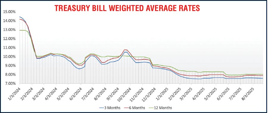 At the weekly Treasury Bill auction held last Wednesday, weighted average yields remained broadly steady, with the rate on the 91-day, 182-day remaining unchanged at 7.58% and 7.89% respectively. The 364-day maturity registered a marginal dip of 01 basis point to 8.02%. However, only 76.85% of the total offered amount was raised, with successful bids amounting to Rs. 59.18 billion against the Rs. 77.00 billion on offer in the first phase of competitive bidding. This marked the third consecutive auction that fell short of fully raising the targeted amount. However, no further subscription was made under the second phase for the second consecutive week.