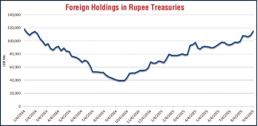 The recovery story in the foreign holdings of Rupee Treasuries continued last week, supported by robust demand. A sizeable net inflow of Rs. 2.78 billion — equivalent to a 2.0% week-on-week increase — was recorded during the week ending 12 September. This marked the third consecutive week of foreign inflows. As a result, foreign holdings rose to Rs. 115.29 billion, reaching the highest level in well over 1 ½ years (since early January 2024).