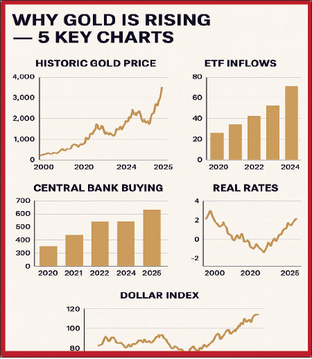In 2025, gold has shattered previous ceilings and surged to record highs, rapidly crossing the $4,000 per ounce mark. This move is not a one-off spike but the result of several concurrent forces: geopolitical tensions (notably US–China and other global flashpoints), broad expectations of future interest-rate cuts in the US (which reduce real yields), sustained central-bank purchases and strong investor (ETF) inflows. These combined factors have created both a demand surge and a scarcity mindset among buyers.
