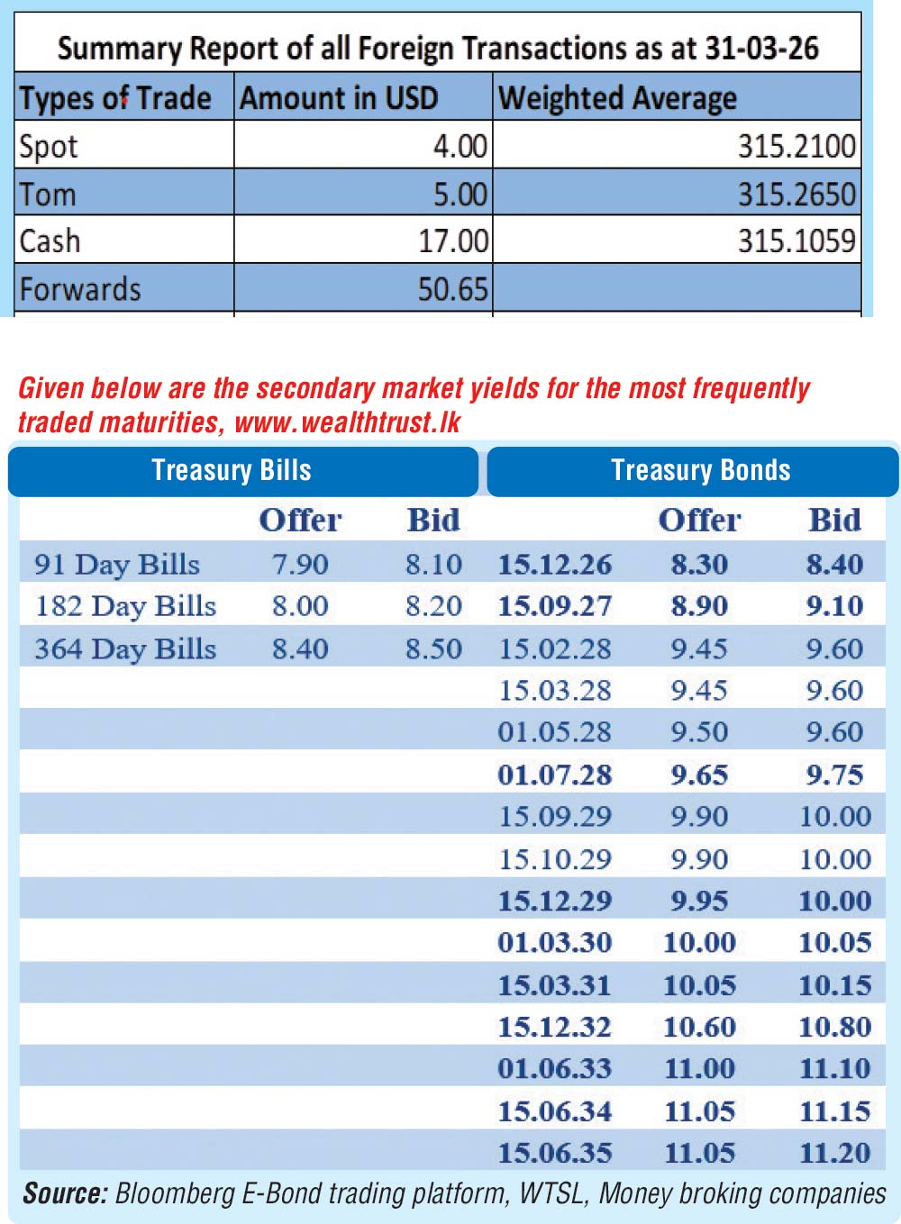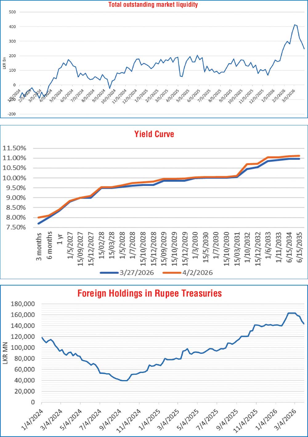 In the money market, the total outstanding liquidity surplus in the inter-bank market remained elevated but dropped to Rs. 247.36 billion as at the week ending 2 April 2026, from Rs. 288.31 billion recorded the previous week. The Domestic Operations Department (DOD) of the Central Bank of Sri Lanka continued to drain out liquidity during the week by way of overnight Repo auctions at weighted average yields ranging from 7.60% to 7.61%.