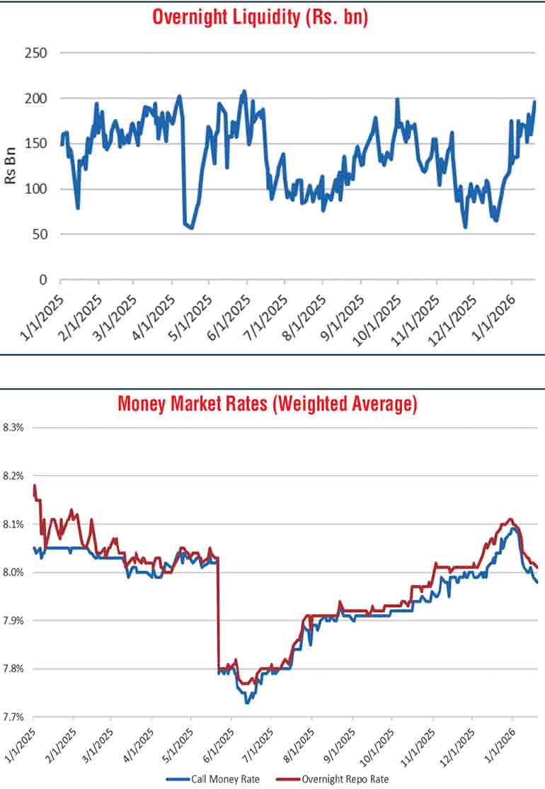 This was spurred by an increased overnight money market liquidity surplus, recorded at Rs. 196.08 billion, up from Rs. 160.19 billion at the close of the previous week. The entire amount was parked at the Central Bank’s Standing Deposit Facility Rate (SDFR) of 7.25%. This marks a trend of steady improvement from the prior month, which saw overnight liquidity touch lows of Rs. 65.92 billion, and represents the highest level observed since end-September 2025.