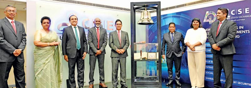 From left: Pan Asia Bank Deputy General Manager – Credit Gayanath De Silva, Deputy General Manager/Company Secretary Nayantha Fernando, CSE CEO Rajeeva Bandaranaike, Pan Asia Bank Director/CEO Naleen Edirisinghe, Chairman Aravinda Perera, CSE Chairman Dimuthu Abeyesekara, CEO-Designate Vindya Jayasekara, and Pan Asia Bank Deputy General Manager Finance Suranga Fernando