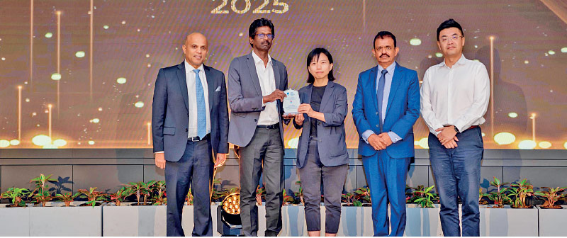 Asian Digital Finance Forum and Awards Convener and Global Fintech Institute, Singapore Industry Fellow Rajkumar Kanagasingam (left) presents the award to Port City Colombo Assistant Managing Director Bai Xiaping. Commercial Bank of Ceylon Chairman Sharhan Muhseen, Central Bank former Assistant Governor Dr. Dharmasri Kumaratunge and Port City Colombo Chief Marketing Officer Li Xing (Stan) are also present