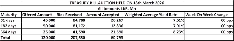 The weekly Treasury Bill auction conducted yesterday saw weighted average yields remain unchanged across the board. Accordingly, the rate on the 91-day Bill was recorded at 7.61%, 182-day Bill at 7.91% and the 364-day Bill at 8.23%. This was in stark contrast to the secondary Bond market which has witnessed an uptrend in rates coinciding with the ongoing Middle East conflict.