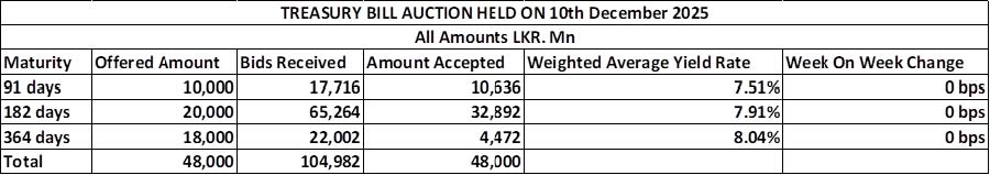 The weighted average rates at the weekly Treasury Bill auction conducted yesterday held steady. Accordingly, the yields on the 91-day, the 182-day and the 364-day tenors were recorded unchanged at 7.51%, 7.91% and 8.03%. This marks the 21st week where T-Bill rates have stayed broadly anchored around prevailing levels.