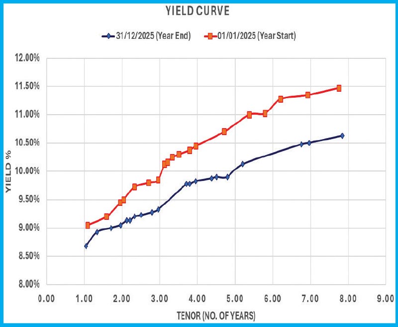 In October, at the start of Q4, rates started to rise on the back of profit taking amidst the absence of strong directional cues. However, following the release of news highlighting an impressive fiscal outperformance for January–September 2025, exceeding several IMF benchmarks and translating into lower funding pressures, the market rallied from mid-October through mid-November. Subsequently, in late November and early December, yields edged higher following the 6th and final Monetary Policy Review of 2025, which delivered a ‘no change’ outcome. This was compounded by profit-taking after the rally, as well as heightened uncertainty stemming from Cyclone Ditwah and its devastating impact. A brief relief rally and recovery was observed following the knee-jerk reaction to the Cyclone in Mid-December but rates again began to climb as the preliminary cost estimates following the cyclone started to surface. The damage culminated in a Rs. 500 billion Supplementary Estimate to the 2026 Budget. The tail end of the year also marked a significant shift in the outcome of the weekly T-Bill auction results, after an extended period of rate stability at primary T-Bill auctions, which had lasted over 22 weeks and kept rates broadly anchored. This stability gave way as yields began to rise materially. The period was also notable for a change in supply dynamics, with the last two Treasury Bill auctions of the year marking the first instances where the offered amounts materially exceeded, or broadly aligned with, estimated maturity volumes. This signaled a clear departure from the undersupply conditions that had characterised the earlier period. As a result, rates picked up once again at the close of the year, curtailed by renewed buying interest kicking in at the higher technical support levels. The Q4 table gives the quarter opening and closing yields for the most liquid/benchmark durations.