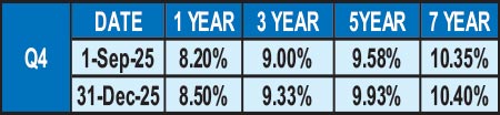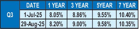 In Q3, rates increased once again following renewed fears surrounding the imposition of the US Reciprocal Tariffs and the finalised details. Speculation was rife with some quarters of the market expecting significantly higher tariffs. However, come August, the market witnessed a change of direction once again following the official announcement that the US had reduced Reciprocal Tariffs for Sri Lanka to 20%, triggering a rally in the secondary Bond market. This announcement triggered a decisive change in sentiment as it was below expectations and considered a favourable development. As a result, yields dropped to fresh lows and continued the downward trend. Subsequently, as profit taking pressures kicked in during the early part of September, and as the market saw activity moderate considerably, in the absence of fresh directional cues, yields were seen drifting upwards. There was a brief relief rally spurred by S&P Global Ratings upgrading Sri Lanka’s long-term foreign currency debt rating to “CCC+” from “Selective Default (SD)”, while affirming the long-term local currency rating at CCC+, with a stable outlook on 19 September which was also supported by a US FED rate cut of 25 basis points during the latter part September as well (the first for the year 2025). The Q3 table gives the quarter opening and closing yields for the most liquid/benchmark durations.