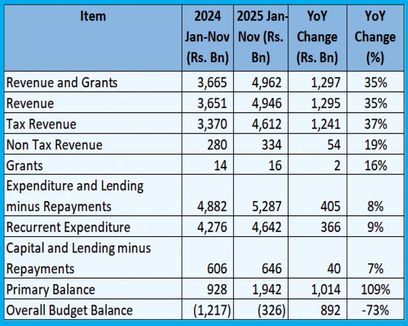 Sri Lanka’s Jan–Nov 2025 (latest data available) fiscal performance reflected a revenue-led, structurally anchored consolidation, with Revenue and Grants rising by Rs. 1.3 trillion (+35% YoY), driven mainly by tax revenue growth of 36.8% following VAT and income tax reforms. Expenditure growth was contained at 8.3%, enabling the primary surplus to more than double to Rs. 1.94 trillion (+109%) and the overall Budget deficit to narrow sharply from Rs. 1.22 trillion to Rs. 326 bn, strengthening fiscal discipline and debt sustainability. This was clear overperformance contributing to healthy Treasury cash buffers and exceeding several IMF benchmarks.