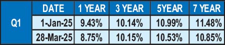 The Government Securities market commenced 2025 on a positive note, extending the momentum from late 2024, during which yields trended downward amid improving macroeconomic conditions. This was further supported by policy continuity and clarity following the completion of the 2024 electoral cycle, which helped alleviate uncertainty-related risk premiums and strengthen investor confidence. The T-Bill and T-Bond markets continued to mostly rally throughout Q1 of 2025 with yields overall trending lower at auctions and dropping in the secondary market as well. This was supported by CCPI inflation starting off the year in deflation at -4% YoY as at January and continuing to be in deflation throughout the quarter, reinforcing an attractive real rate environment. In addition, a robust fiscal consolidation contributed towards reduced Budget deficits and healthy Treasury cash buffers which further supported the rally. The Q1 table, gives the quarter opening and closing yields for the most liquid/benchmark durations.