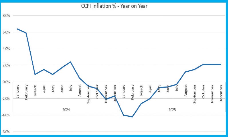 The year 2025 experienced low and stable inflation, recording deflation through January to July in terms of CCPI index. This carried on a streak of 11 months of deflation from September of 2024. In August the trend was broken and inflation edged back up into positive territory, however the figures came in well below the Central Banks target of 5% and even below the lower band of 3 of the target band.