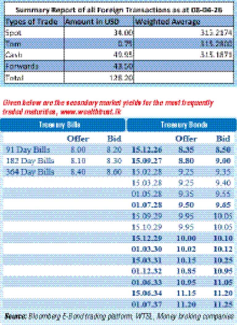 In the forex market, the USD/LKR rate on spot contracts were seen closing the day at Rs.315.60/315.90 as against its previous day’s closing level of Rs. 315.30/315.40. The total USD/LKR traded volume for 08th April 2026 was $ 128.20 million.