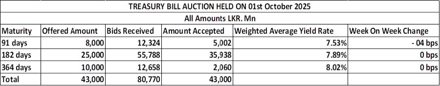 The weekly Treasury Bill auction conducted yesterday saw the entire Rs. 43.00 billion total offered amount fully subscribed. This marked the first instance in six weeks that a T-Bill auction raised the entire targeted offered amount. The bids received to offered amount ratio stood at 1.88 times.