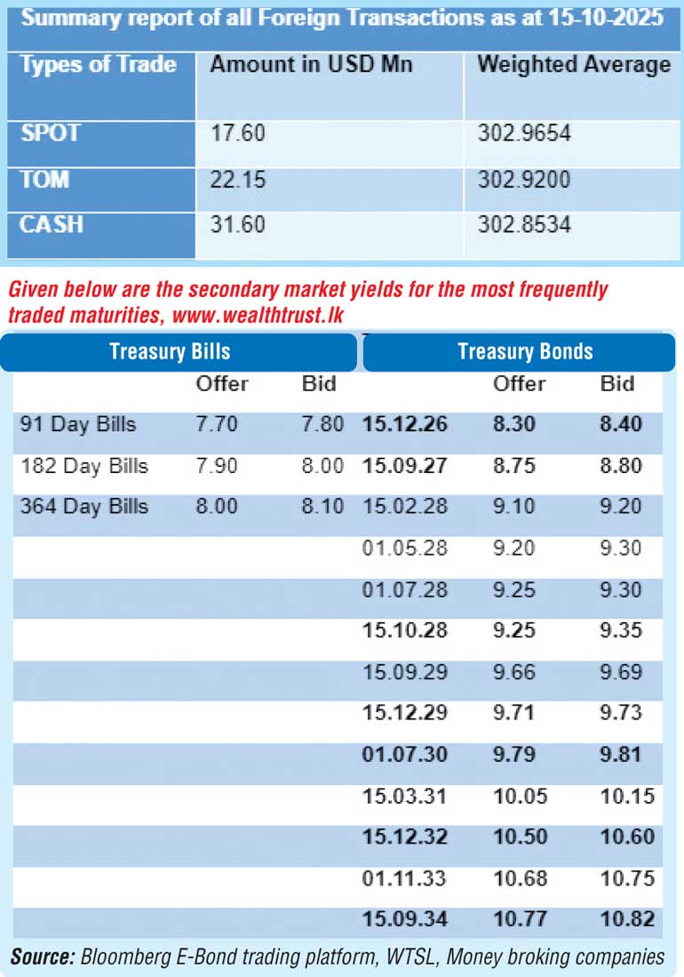 The USD/LKR rate spot contacts in the forex market, traded above Rs. 303.00 for the second consecutive day as it traded within the range of Rs. 302.98 to Rs. 303.05 yesterday before closing the day at Rs. 303.00/10 against its previous day’s closing level of Rs. 302.95/00.