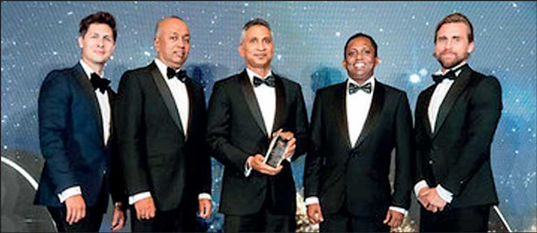 From right: Euromoney Global Head of Accreditation Research Ben Naylor, Sampath Bank Head of Sustainability Nuwan Pathirana, Managing Director Designate Sanjaya Gunawardana, Chief Human Resource Transformation Officer Dr. Lalith Weragoda, and Euromoney Award Ceremony Presenter and Magician Ben Hanlin
