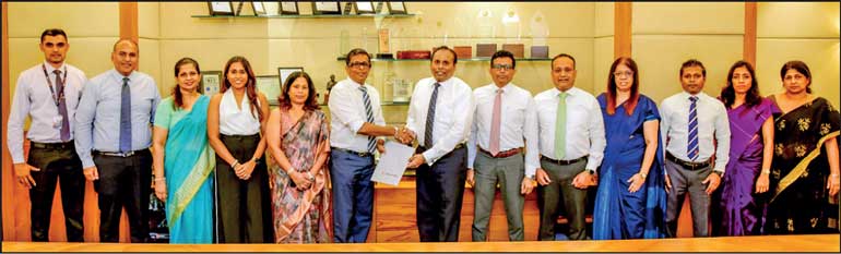 Home Lands Skyline Chairman/Managing Director Nalin Herath (sixth from left) and Sampath Bank Chief Operating Officer Deepal De Silva (seventh from right) exchange agreement in the presence of