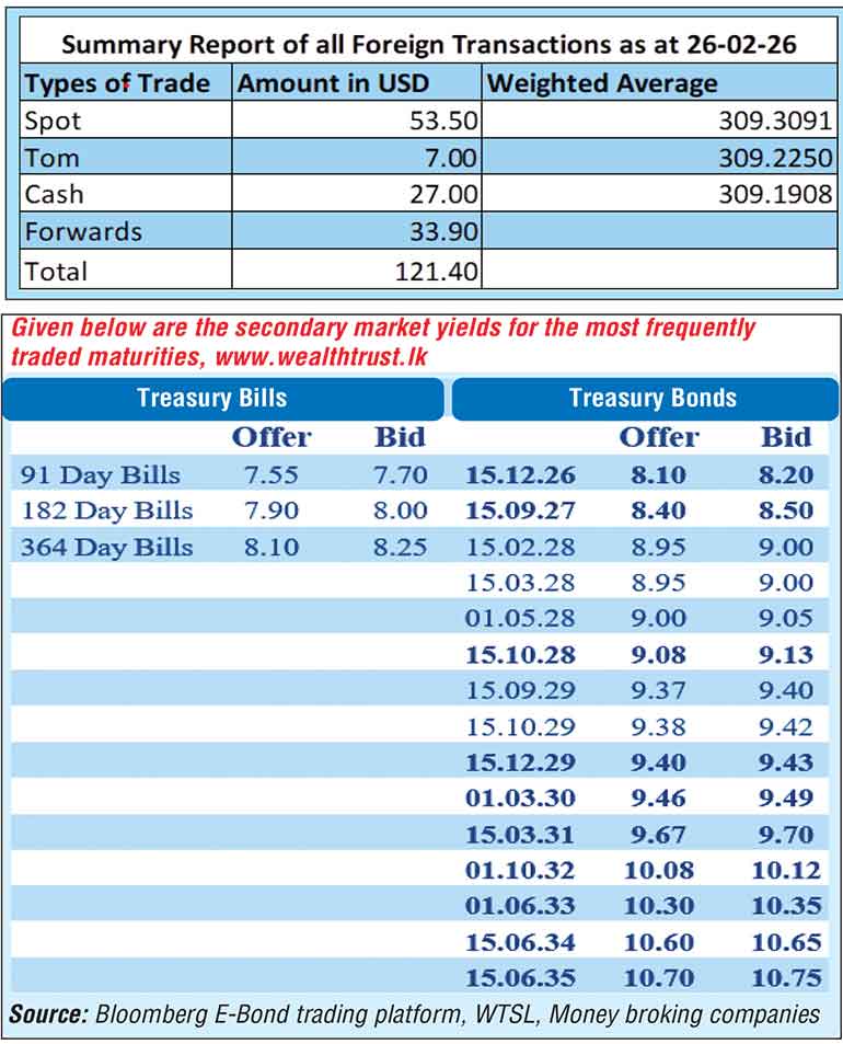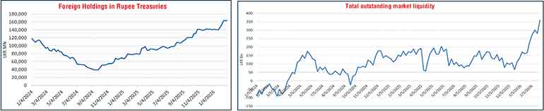 In the money market, the total outstanding liquidity surplus in the inter-bank market stood at Rs. 358.76 billion as at the week ending 27 February 2026, up from Rs. 280.75 billion recorded in the previous week. The Domestic Operations Department (DOD) of the Central Bank continued to drain out liquidity during the week by way of overnight repo auctions at weighted average yields ranging from 7.62% to 7.64%, as well as 1 week term repo at the rate of 7.74%.