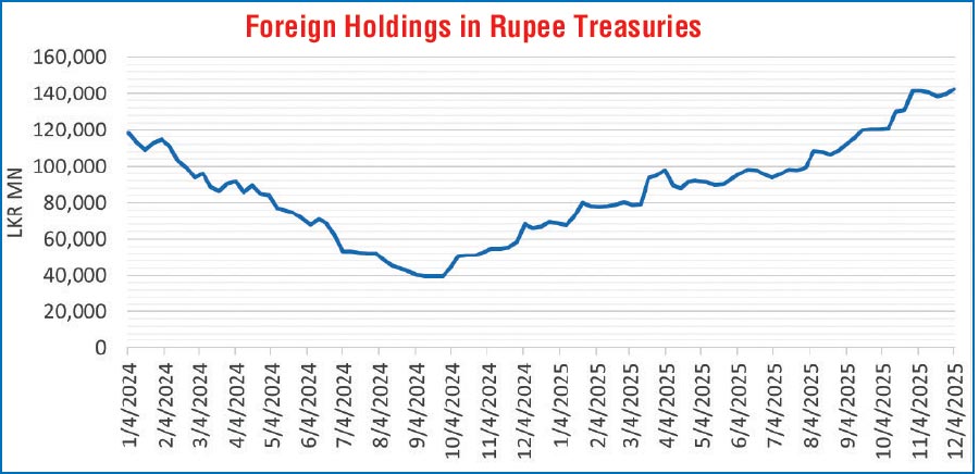 The foreign holdings of rupee-denominated Government securities continued their upward trajectory last week, recording a net inflow for the second consecutive week, amounting to Rs. 2.92 billion — a 2.00% week-on-week increase. Consequently, total holdings rose to Rs. 142.45 billion reaching the highest value in 2 years (since November 2023).