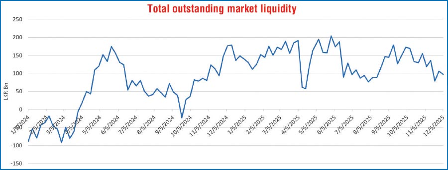 In the money market, the total outstanding liquidity surplus in the inter-bank money market reduced to Rs. 96.90 billion as at the week ending 5 December, 2025, from Rs. 105.80 billion recorded the previous week.