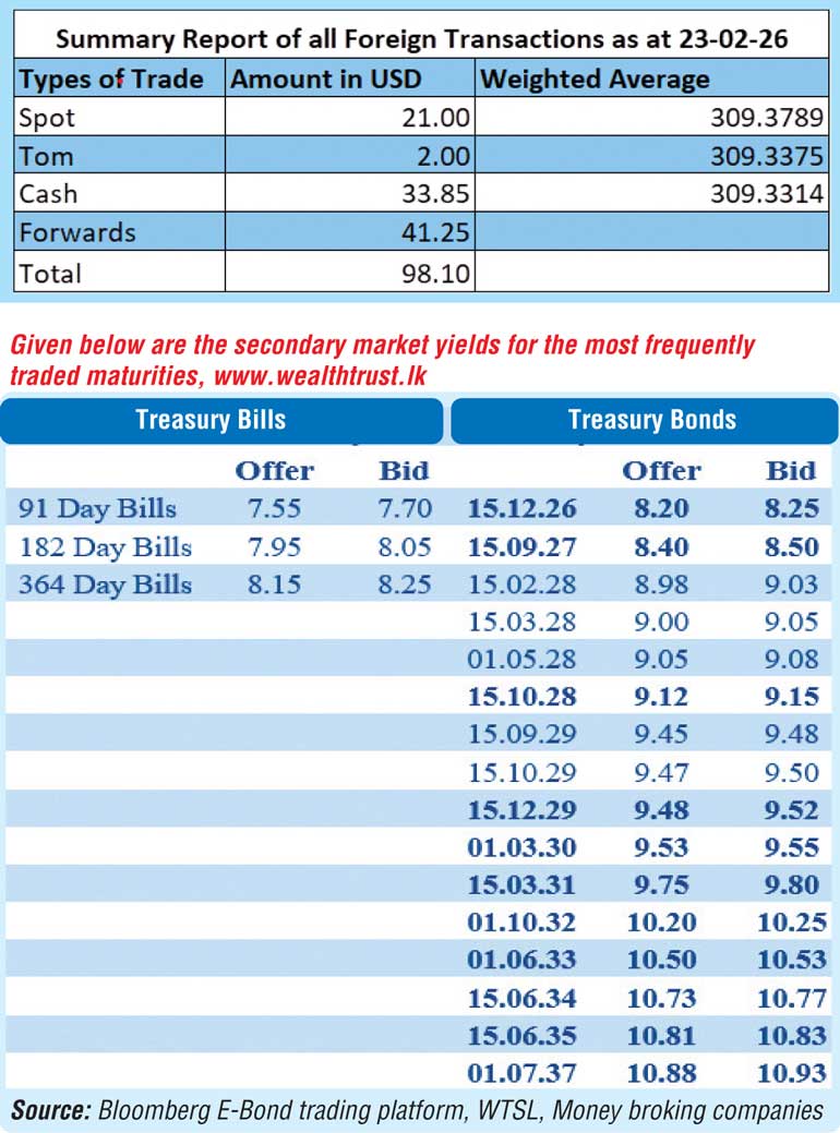 Despite this, transaction volumes remained healthy, supported by several block trades as renewed buying interest emerged at the recently elevated yield levels, curtailing further upwards movement. However, overall market participants continued to adopt a cautious, wait-and-see approach ahead of the back-to-back Treasury Bill and Bond auctions, as well as the release of the February 2026 CCPI inflation data later this week.