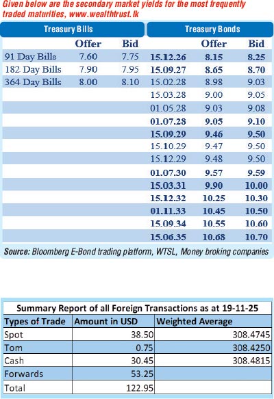 In money markets, the net liquidity surplus was recorded at Rs. 102.60 billion yesterday. An amount of Rs. 104.44 billion was deposited at Central Bank’s SDFR (Standing Deposit Facility Rate) of 7.25%, while an amount of Rs. 1.84 billion was withdrawn from the Central Bank’s SLFR (Standard Lending Facility Rate) of 8.25%.