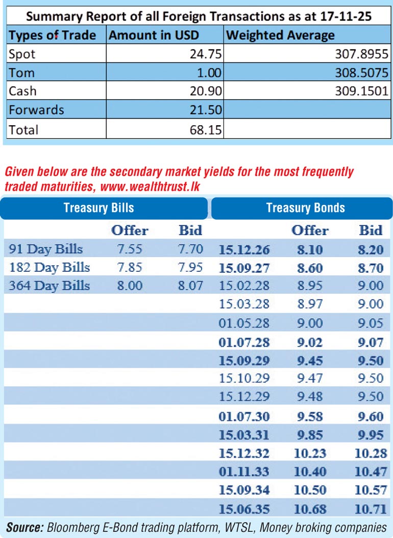 The total secondary market Treasury Bond/Bill transacted volume for 17 November was Rs. 7.62 billion. In money markets, the net liquidity surplus was recorded at Rs. 87.79 billion yesterday. An amount of Rs. 88.55 billion was deposited at Central Bank’s SDFR (Standing Deposit Facility Rate) of 7.25%, while an amount of Rs. 0.76 billion was withdrawn from the Central Bank’s SLFR (Standard Lending Facility Rate) of 8.25%.