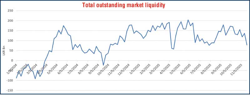 In the money market, the total outstanding liquidity surplus in the inter-bank money market dropped to Rs. 78.27 billion as at the week ending November 21st, 2025, from Rs. 136.12 billion recorded the previous week.