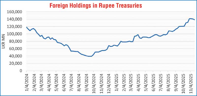 Foreign holdings of rupee-denominated Government securities recorded a net outflow for the second consecutive week, amounting to Rs. 1.87 billion and as a result the total holdings dropped to Rs. 138.53 billion as at the close of the week ending 21 November.