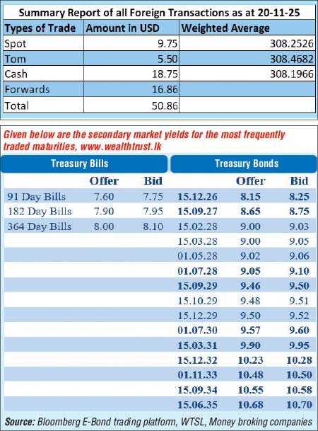 The weighted average interest rates on call money and repo were recorded within the ranges of 7.93%-7.94% and 7.96% respectively while the Central Bank of Sri Lanka’s (CBSL) holding of Government Securities was registered at Rs. 2,508.92 billion as at 21 November 2025, unchanged against the previous week’s closing level.
