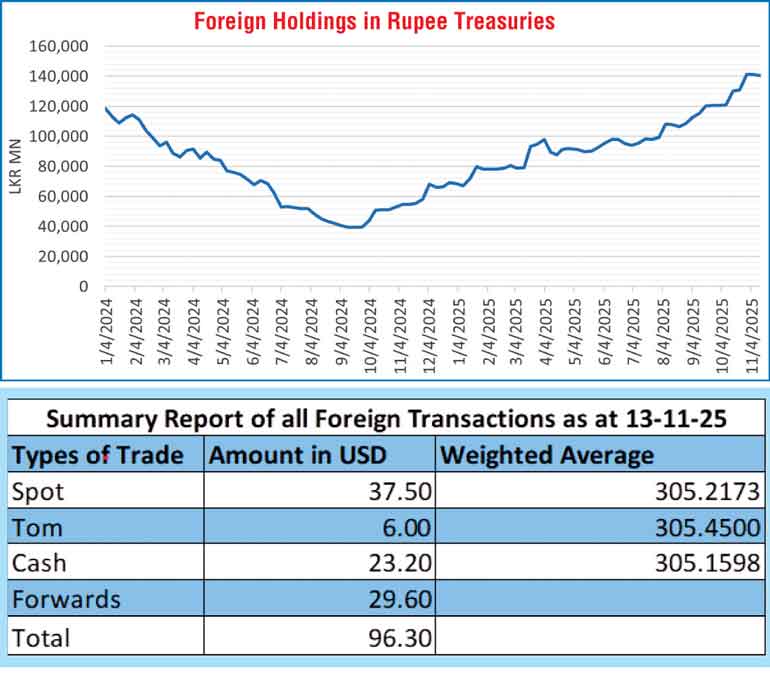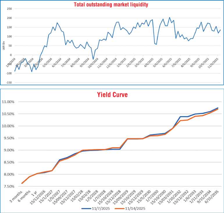This was followed by a round of Treasury Bond auctions held last Thursday (13 November) offering Rs 80 billion across two maturities. Both maturities were fully accepted at the first phase in competitive bidding, with total bids exceeding the offer by 2.73 times. This marked the first successful full uptake in seven consecutive auctions and reflected the strong bullish sentiment following recent secondary market rallies.