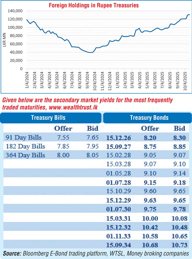 For context, these developments come against the backdrop of a U-shaped recovery in foreign holdings of rupee-denominated Government securities. As of last week (23 October 2025), total foreign holdings in Government Securities had risen to Rs. 130.96 billion, the highest level in nearly two years since mid-November 2023. This trend underscores a robust rebound in foreign investor appetite for domestic Treasury bills and bonds, up 233% from a low of Rs. 39.38 billion recorded in September 2024.