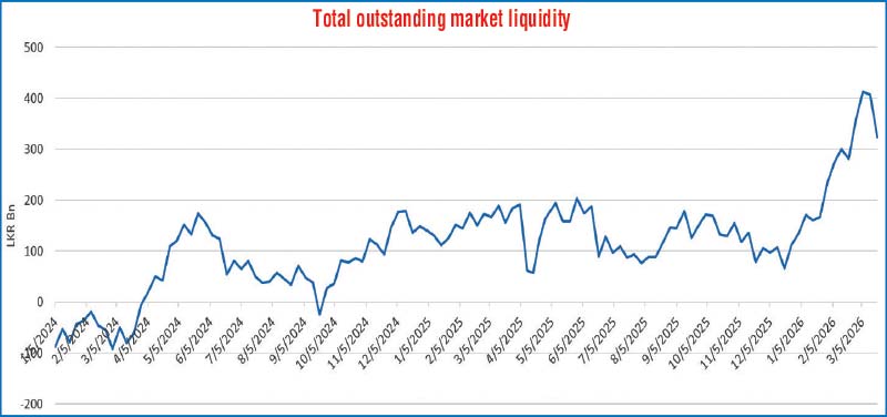 In the money market, the total outstanding liquidity surplus in the inter-bank market remained elevated however dropped to Rs. 323.04 billion as at the week ending 20 March 2026, dipping slightly from Rs. 406.78 billion recorded the previous week. The Domestic Operations Department (DOD) of Central Bank continued to drain out liquidity during the week by way of overnight repo auctions at weighted average yields ranging from 7.46% to 7.59%, as well as one week term repo at the rate of 7.61%.