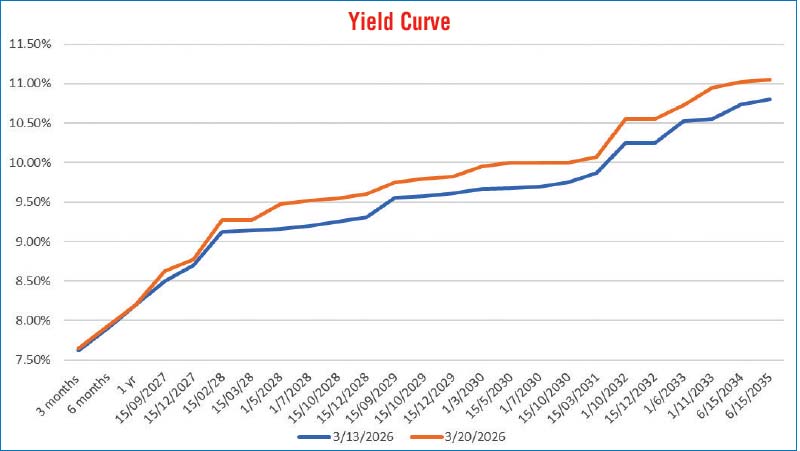 During the week, the 15.05.26 maturity traded within the range of 8.00%–8.10%. The 01.05.27 maturity traded at 8.35% to 8.54%, while the 15.09.27 maturity traded up from an intraweek low of 8.50% to a high of 8.60%.
