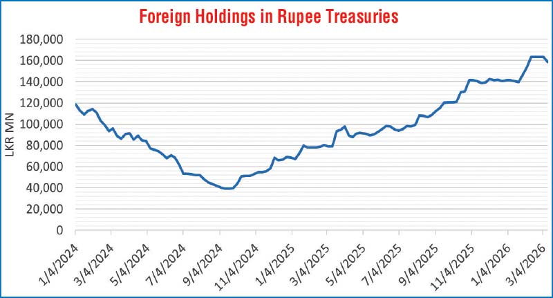 The foreign holdings of rupee-denominated Government securities recorded a net outflow for the third consecutive week amounting to Rs 1.38 billion and as a result, total foreign holdings dipped to Rs. 157.28 billion during the week ended 19 March.